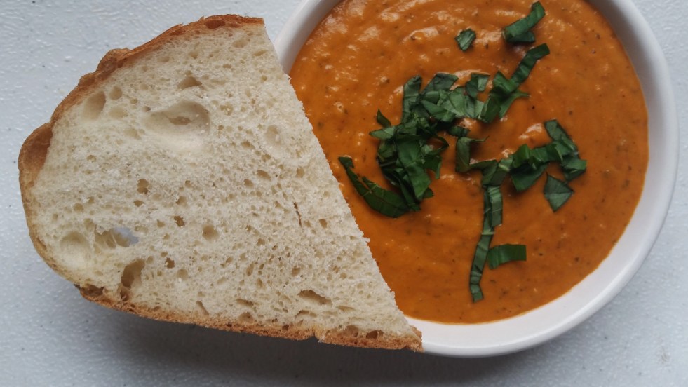 I made this awesome tomato soup last week. It has fucking parmesan in it. Reading that made me so happy, so I immediately had to make it. The only problem I had with this recipe was the roux. It was way too thick. There was no reason to have so much flour involved here, so I cut the quantity in half for my recipe. I also used veggie stock instead of chicken, because I make my own. I feel like this blog is coming across as being only vegetarian. I’m not actually a vegetarian. I just try to use veggies as much as possible, and don’t eat very much meat in general. Also, the meat that I do consume is only purchased from the farmers’ market, or local co-op. It’s always locally and humanely raised. Same goes for my eggs and dairy.