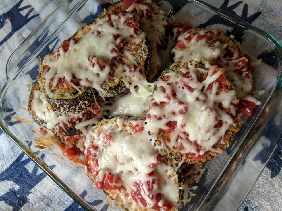 Preheat oven to 400 degrees. Grease an 8 x 8 baking dish and a large baking sheet. Place the beaten egg in a shallow bowl. In another shallow bowl, mix the bread crumbs, salt, pepper, and parmesan cheese. Dip the eggplant, one by one, into the egg, then the bread crumbs. Make sure to thoroughly coat everything. Place them in onto the baking sheet in a single layer. Bake for 35 minutes, flipping halfway through. Once they’re done, you’ll start layering. In the 8 x 8 baking dish, first spread out about 1/4 cup of the tomato sauce. Place a few of the eggplant slices over that, then more sauce, then cheese, then eggplant, then sauce, cheese, eggplant, etc. End with the cheese. Bake for an additional 20 minutes, or until the cheese is all melted and gooey. You can either slice it like lasagna, or scoop up individual slices. I was trying the individual slice method, but I don’t recommend it. Baking this took way longer than it should have, and that is when I discovered that my oven runs cold. It turned out way better when I made it at T’s place, but his lighting is for shit.